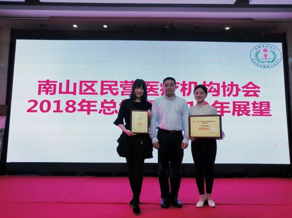 瑞安医疗荣获“先进单位”与“特殊贡献奖”,南山卫计局彭科长(中)与瑞安医疗代表罗丽(左)、胡沅沅(右)