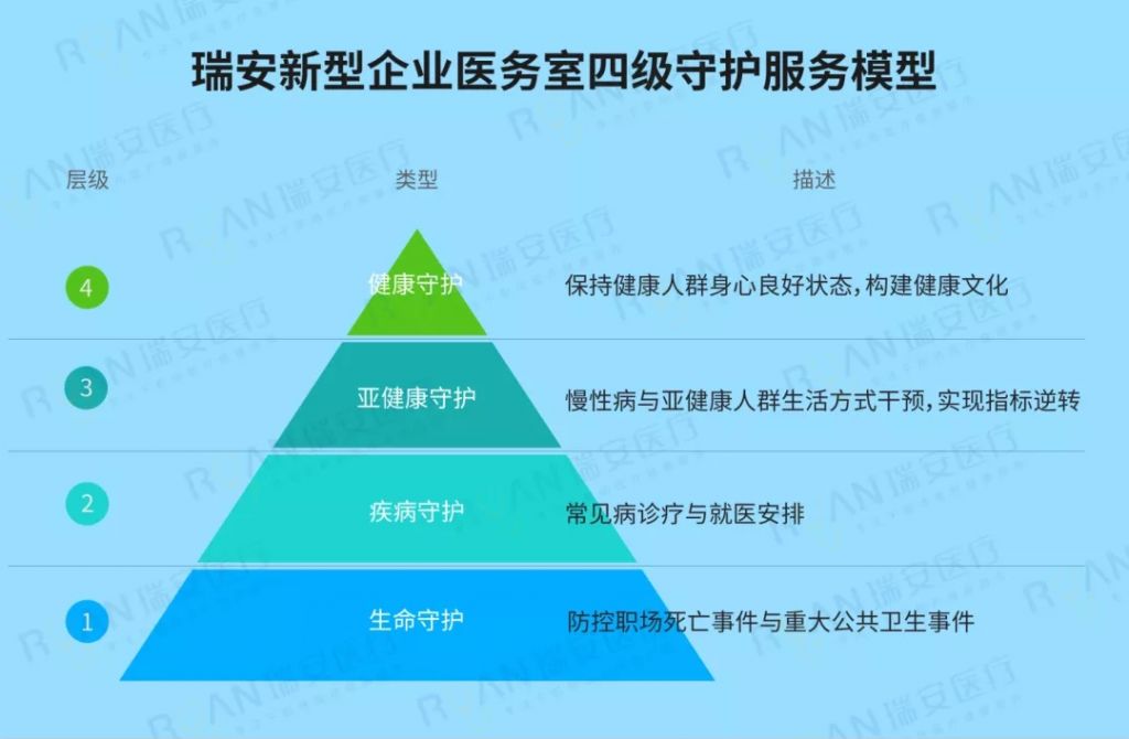 瑞安医疗专注于职场人群医疗健康服务管理、健康企业建设的研究方向,依托多年企业医务室的筹备与运营经验,自主创新开发的新型职场四级守护企业医务室,已在众多知名企业中实践运营,获得了一致认可与好评。