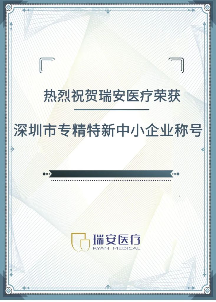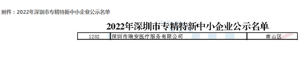 2023年3月15日,深圳市中小企业服务局正式公布2022年专精特新中小企业入选名单,经专家综合评定并公示,深圳市瑞安医疗服务有限公司荣获“深圳市专精特新中小企业”称号。