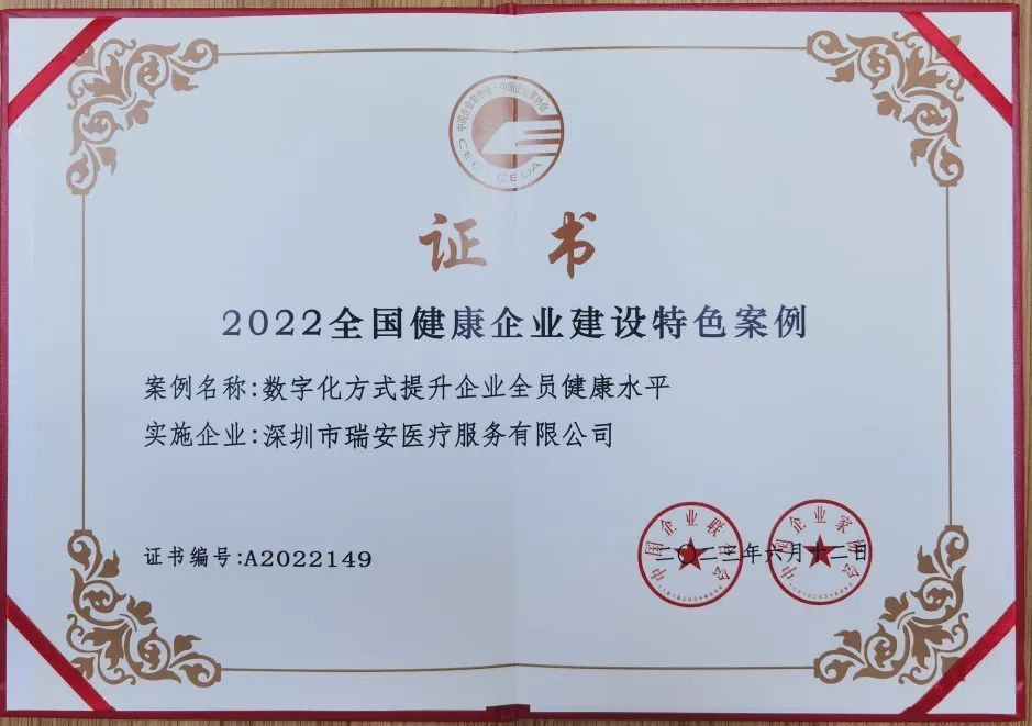 为深入贯彻落实党的二十大精神,落实国务院办公厅《“十四五”国民健康规划》“推进健康企业建设,培育一批健康企业特色样板”的工作要求,交流健康企业建设经验与成果,进一步推动健康企业建设和健康产业发展。中国企业联合会中国企业联合会组织开展了“2022全国健康企业建设特色案例及企业家和职工健康故事征集”活动,瑞安医疗的“数字化方式提升企业全员健康水平”成功入选了2022全国健康企业建设特色案例。