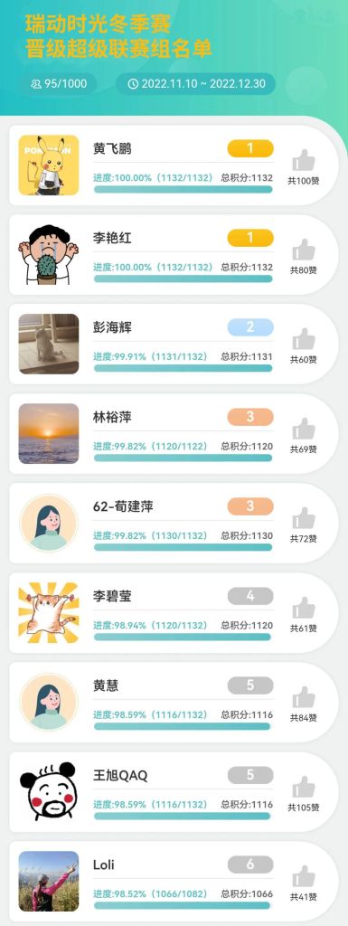 瑞动冬季赛积分进度大于10%的小伙伴,将按按积分进度百分数*10分,作为绩效健康加分项,将直接加到12月的KPI绩效得分上。